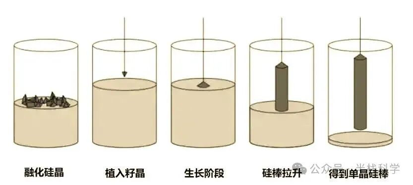在硅种的引导下,离开液面的硅原子会按照一定的顺序凝固,从而形成排列有序的单晶硅柱。