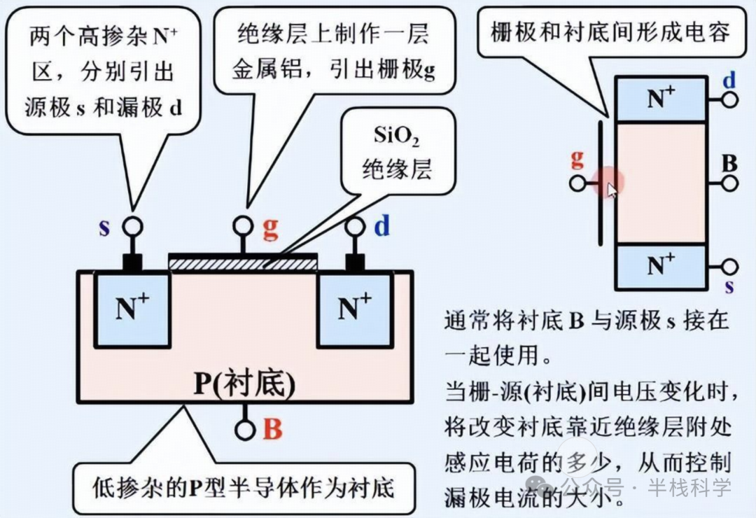 - 在半导体上制作一层SiO2绝缘层,在SiO2上制作一层金属铝,引出电极,作为栅极g