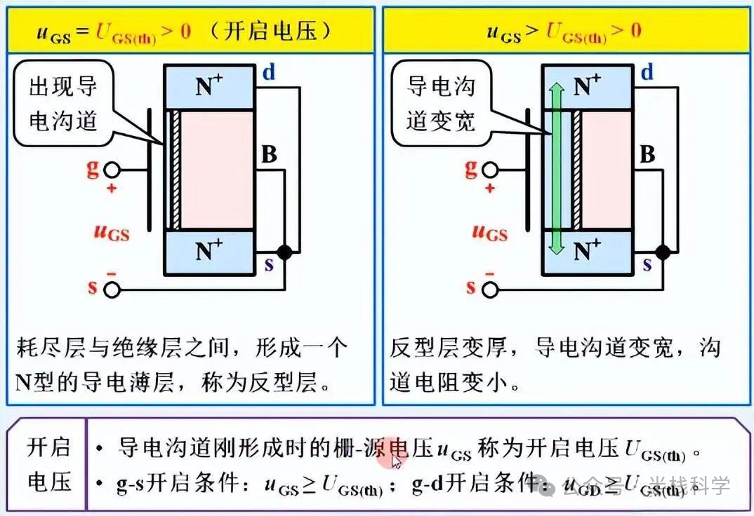 当Uds=0,且Ugs继续增大,一方面耗尽层将变宽,另一方面将衬底的自由电子吸引到栅极与耗尽层之间 ,形成N型导电薄层,这里的负电荷数量远大于空穴数量(类似N型半导体)。在P型半导体上出现N型半导体,所以将N型导电薄层称为反型层。而反型层就构成DS之间的导电沟道, Ugs越大,反型层越厚,导电沟道电阻越小。