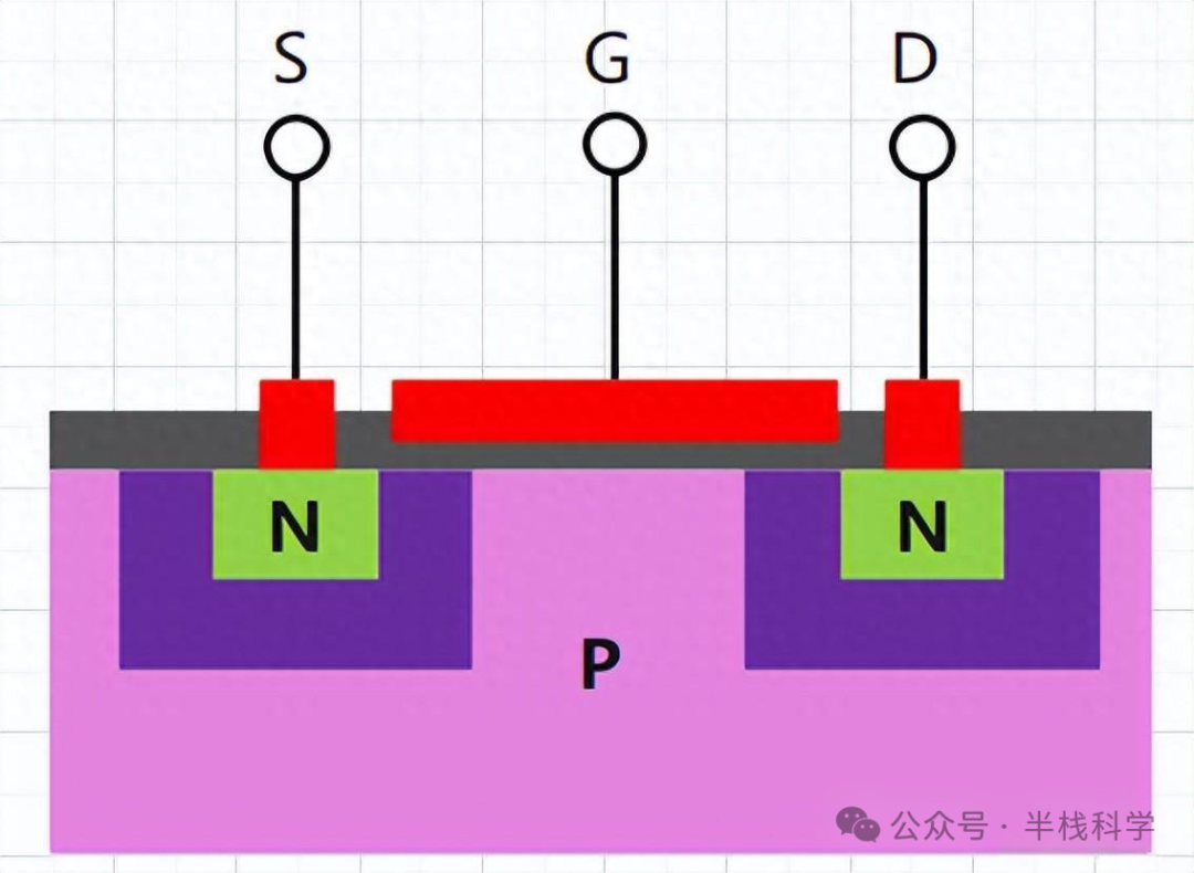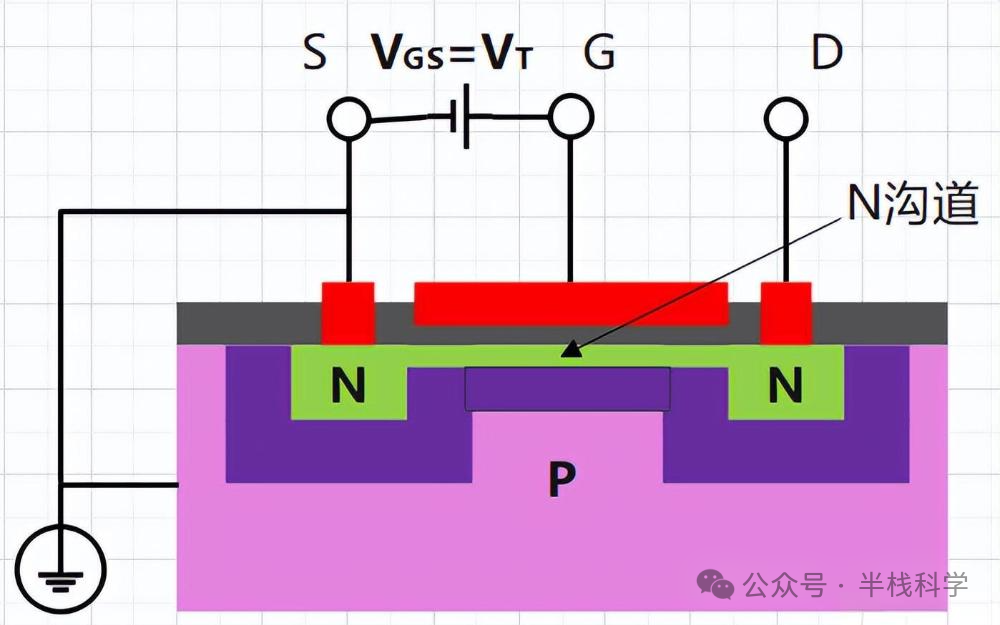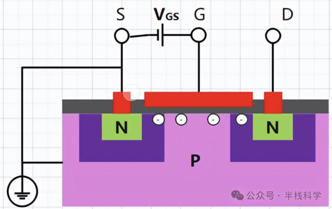 如果把源极(S)和基底(P型)接地,此时PN结的内部电场依然维持。此时如果在栅极(G)和源极(S)之间加正电压,由于在栅极(G)和基底(P型)之间的二氧化硅绝缘层很薄,