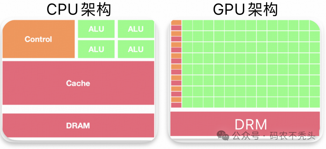 如果说CPU像一个精明强干的项目经理,那GPU就是一个拥有成百上千“螺丝钉工人”的大型流水线。来看一张对比图: