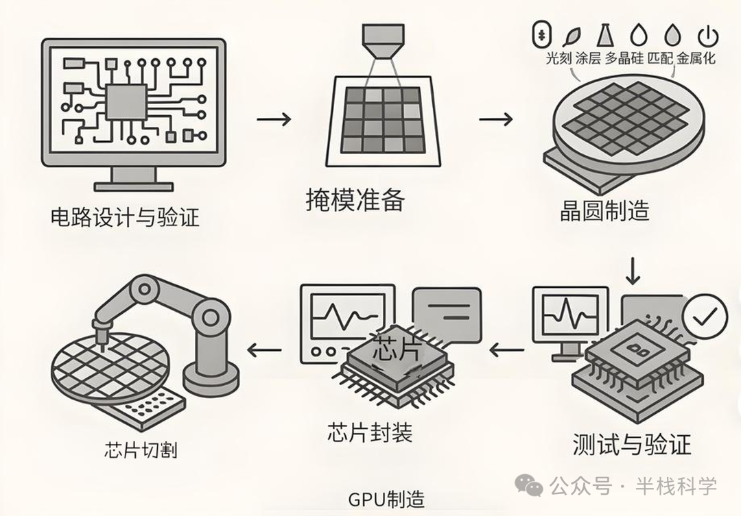 之前我们在芯片制造过程那篇,详细讲了芯片的制造过程, GPU就是芯片的一种,跟CPU只是设计架构不同而已,制造过程类似。