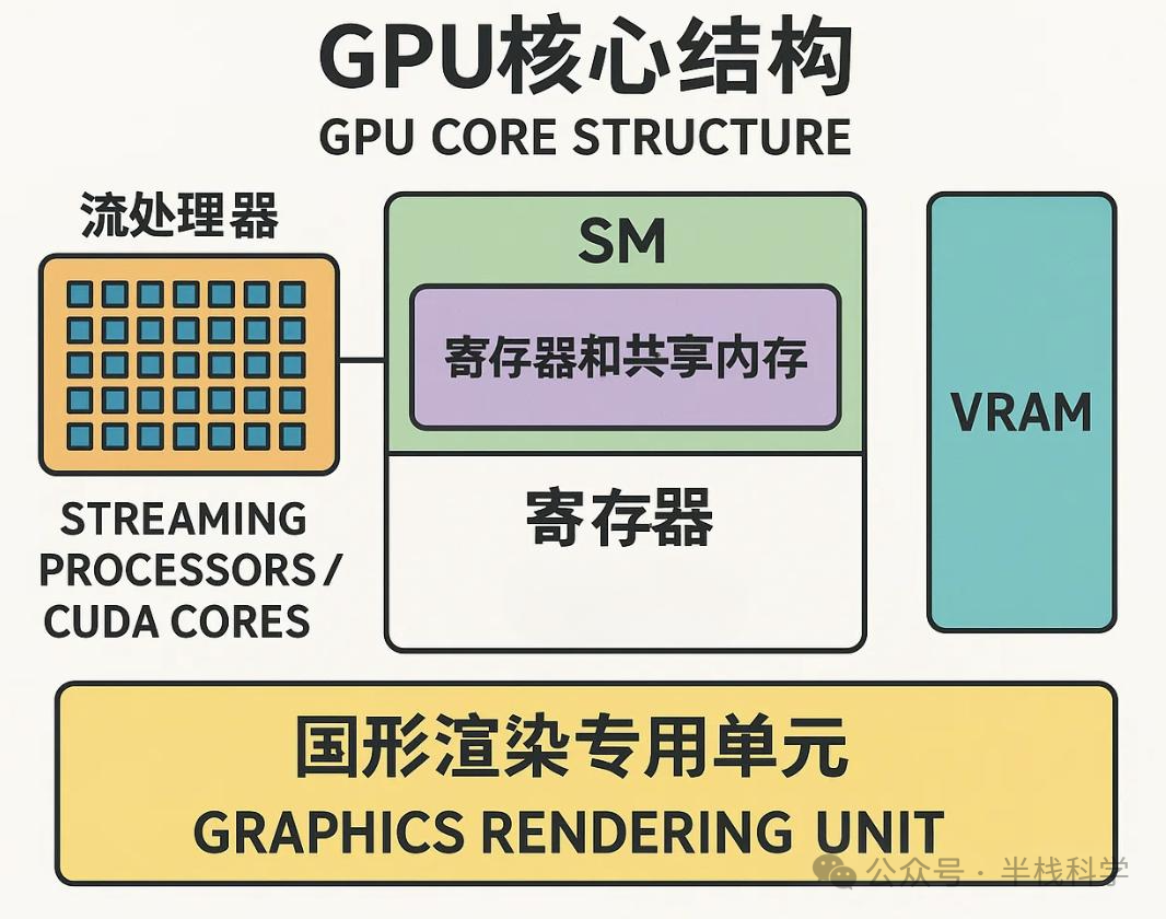 GPU 的“螺丝钉工人”,负责执行浮点数运算、整数计算等基本指令,数量通常成百上千个。SM(Streaming Multiprocessor)流式多处理器