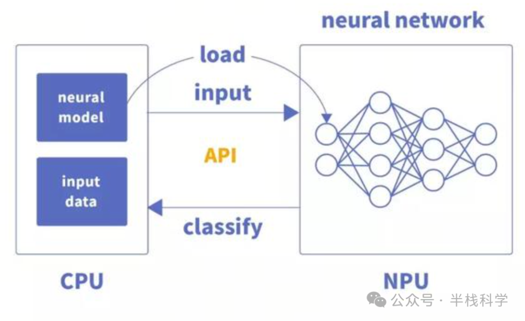 CPU将编译好的神经网络模型文件和权重文件交由专用芯片加载,完成硬件编程。