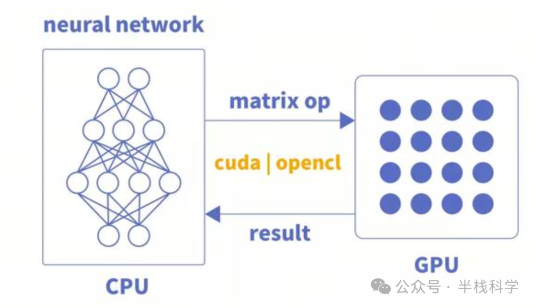 CPU加载权重数据,按照代码构建神经网络模型,将每层的矩阵运算通过CUDA或OpenCL等类库接口传送到GPU上实现并行计算,