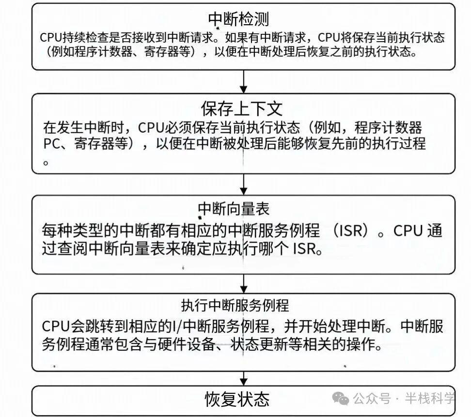 恢复状态:当中断服务程序执行完毕后,CPU从中断向量表中获取保存的上下文信息,并恢复之前的执行状态。