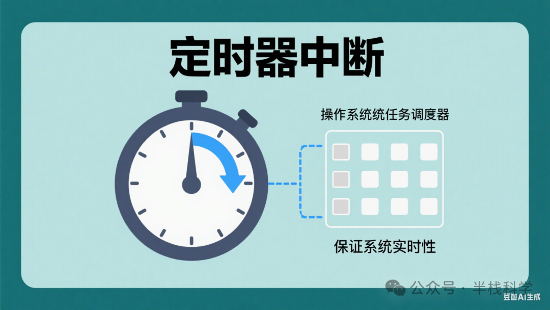 定时器中断:定时器每隔一定时间发送中断请求,操作系统通过定时器中断来进行任务调度,保证系统的实时性。