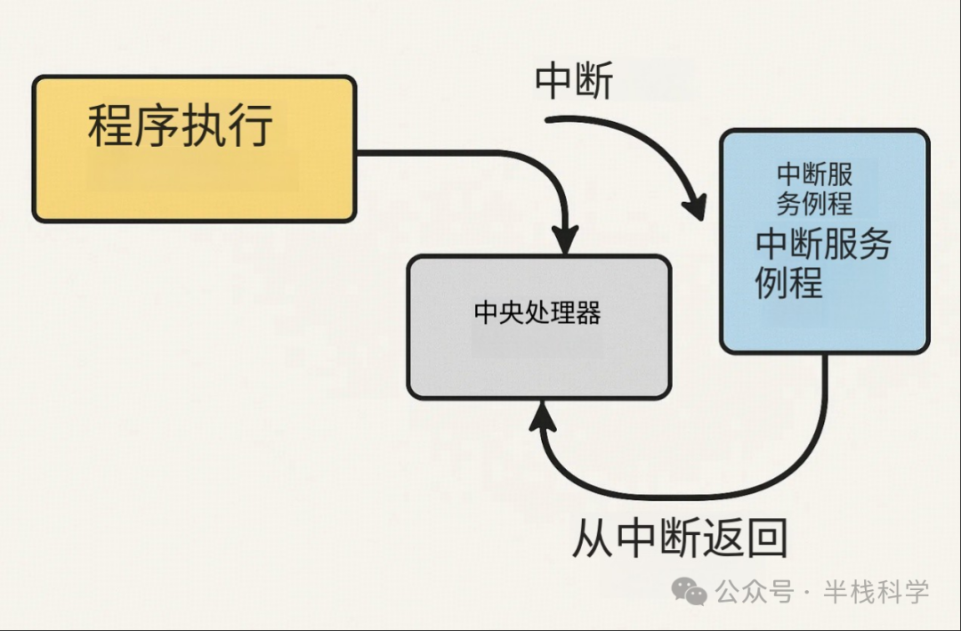 中断是CPU在执行程序时,由硬件或软件发出的信号,要求暂停当前的执行流程并跳转到中断服务程序(ISR, Interrupt Service Routine)进行处理。