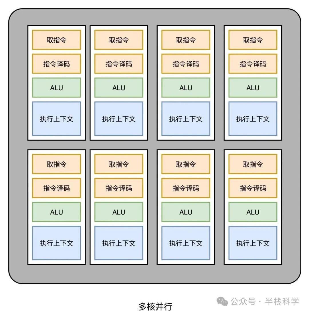 这样一来,我们的GPU电路就比CPU简单很多了。于是,我们就可以在一个GPU里面,塞很多个这样并行的GPU电路来实现计算,就好像CPU里面的多核CPU一样。