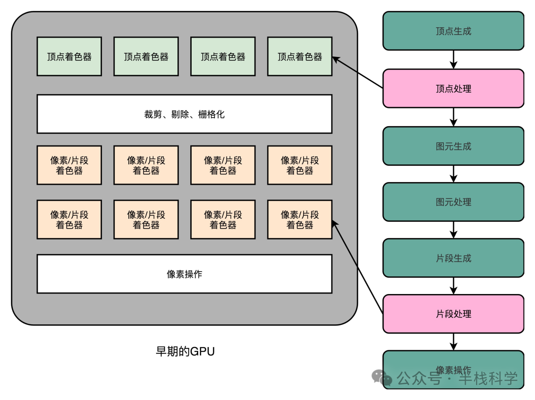 这个时候的GPU,有两类Shader,也就是Vertex Shader和Fragment Shader。我们在上一讲看到,在进行顶点处理的时候,我们操作的是多边形的顶点;在片段操作的时候,