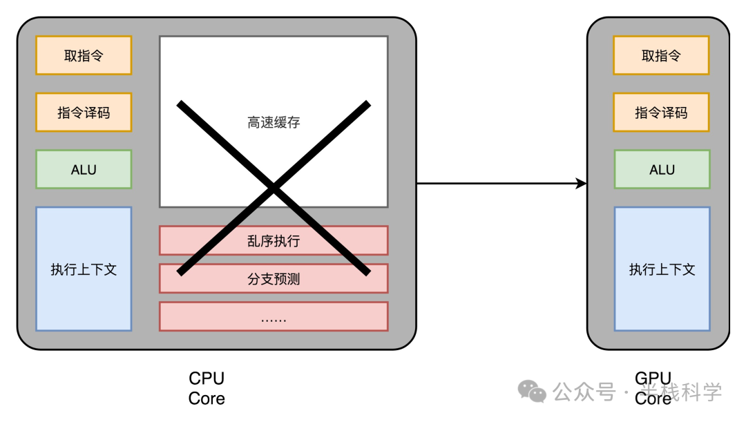 我们可以把GPU里这些对应的电路都可以去掉,做一次小小的瘦身,只留下取指令、指令译码、ALU以及执行这些计算需要的寄存器和缓存就好了。