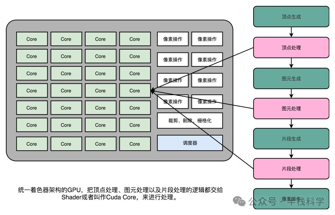 无论是对多边形里的顶点进行处理,还是屏幕里面的每一个像素进行处理,每个点的计算都是独立的。所以,简单地添加多核的GPU,