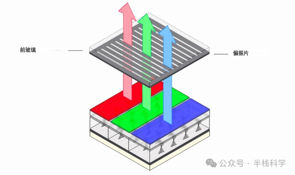 来控制传递到下一层的偏振度,进而控制其强度。每个子像素都有其独立的液晶单元,这使我们能够分别控制红色、绿色和蓝色分量的强度。