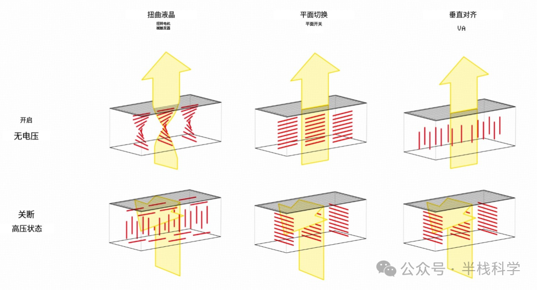 主要区别在于晶体结构的取向——其目的是为了克服TN液晶的一些缺点,例如TN液晶在关闭状态下遮光效果不佳,以及色彩准确度相对较差。