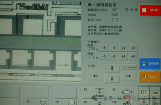手动校准(保证切割精准):进入2.0界面→F4半自动切割(2.4界面)→F4手动校准(2.4.4界面):①找划片槽:点击图像区域找到目标位置,