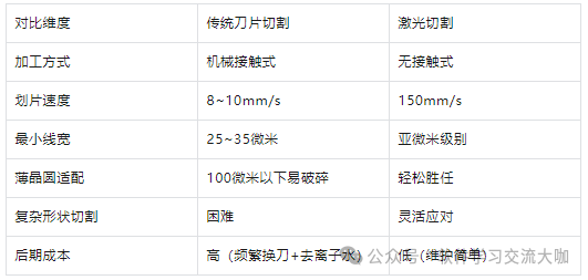简单说,刀片切割就像用菜刀切玻璃,虽然能切开,但边缘容易崩口、速度慢,还得频繁磨刀换刀,麻烦事儿一堆~